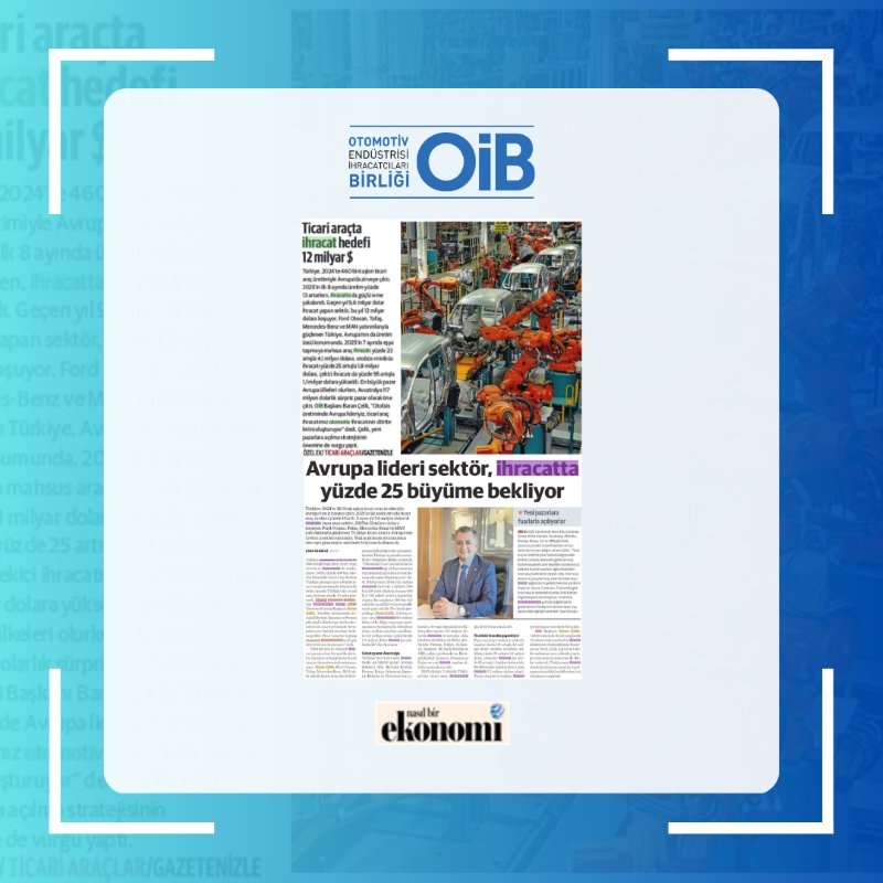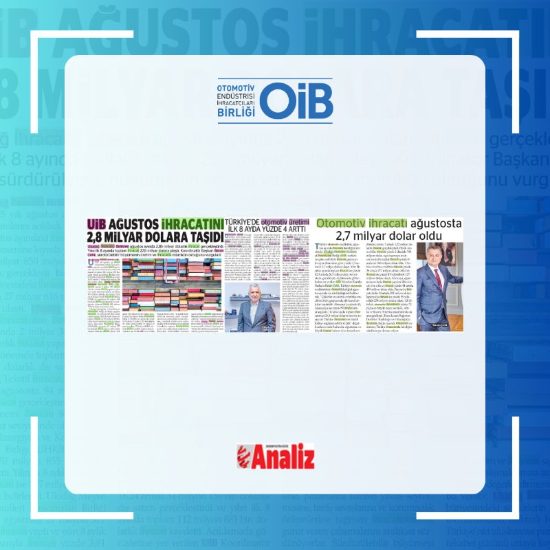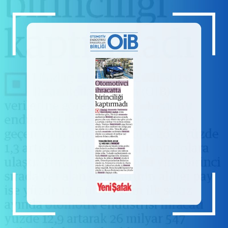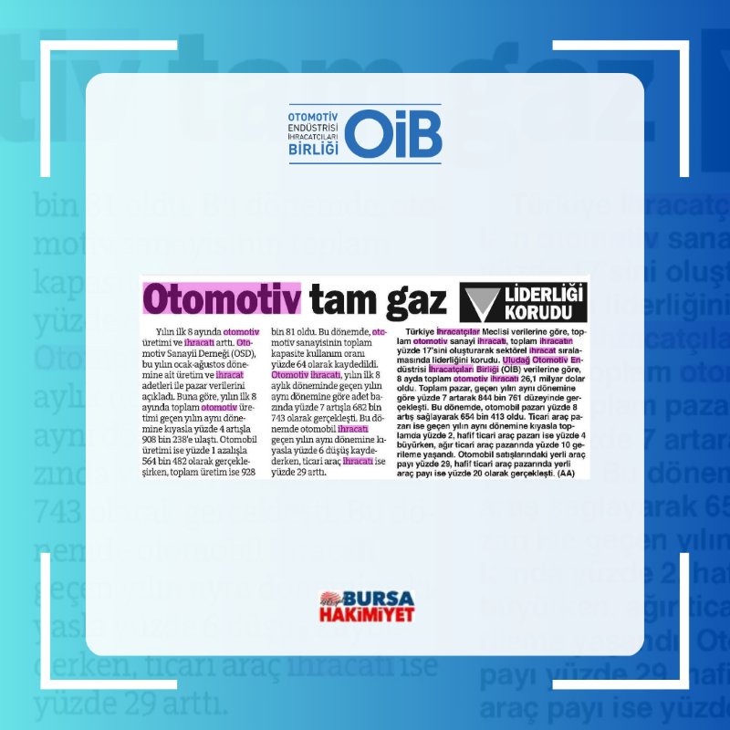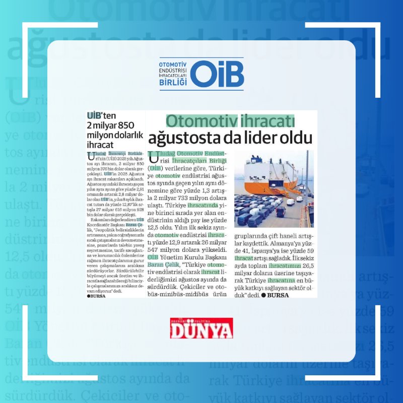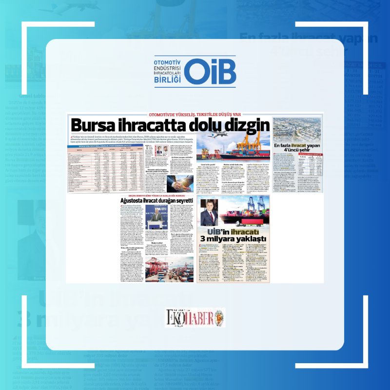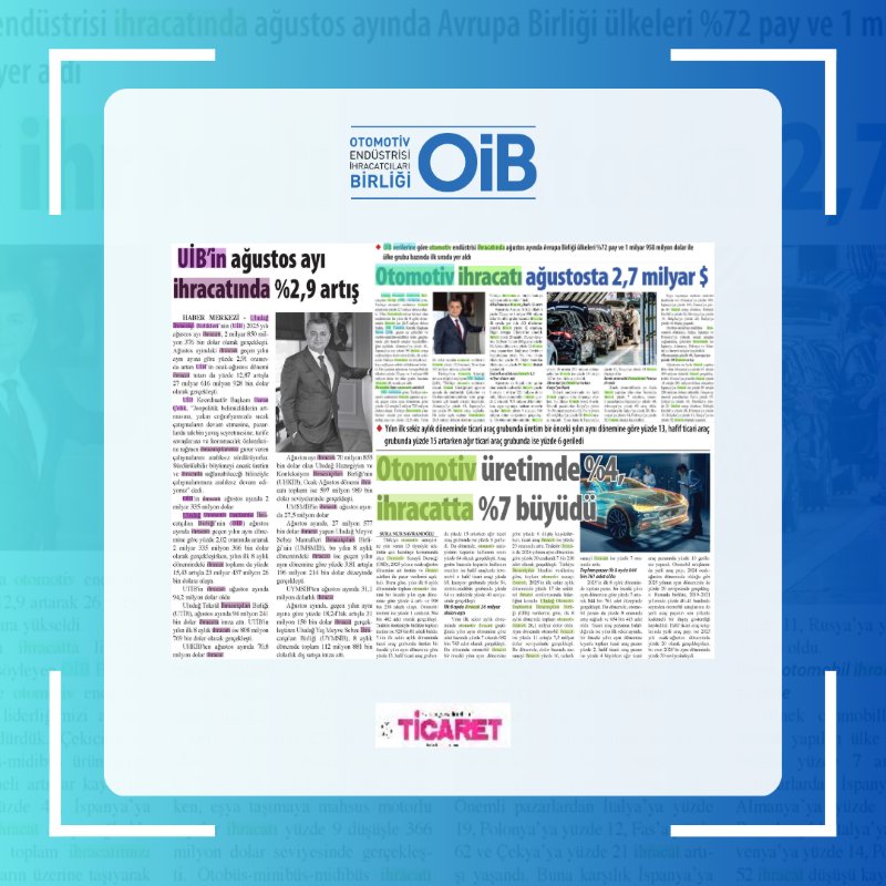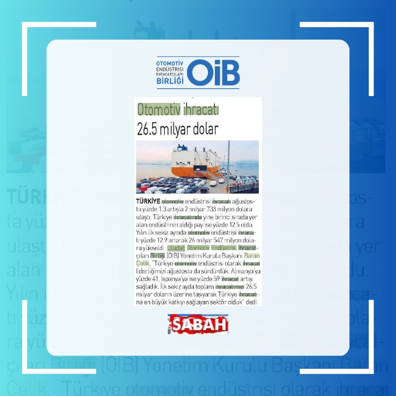 Uludağ Otomotiv Endüstrisi İhracatçıları Birliği (OİB) verilerine göre, Türkiye otomotiv endüstrisi ihracatı eylülde geçen senenin aynı dönemine göre yüzde 7,7 artışla 3 milyar 661 milyon dolar oldu. Türkiye ihracatında birinci sırada yer alan endüstrinin aldığı pay ise yüzde 16,2 olarak gerçekleşti. Yılın ilk dokuz ayında otomotiv endüstrisi ihracatı geçen senenin aynı dönemine göre yüzde 12 artarak 30 milyar 205 milyon dolar oldu.