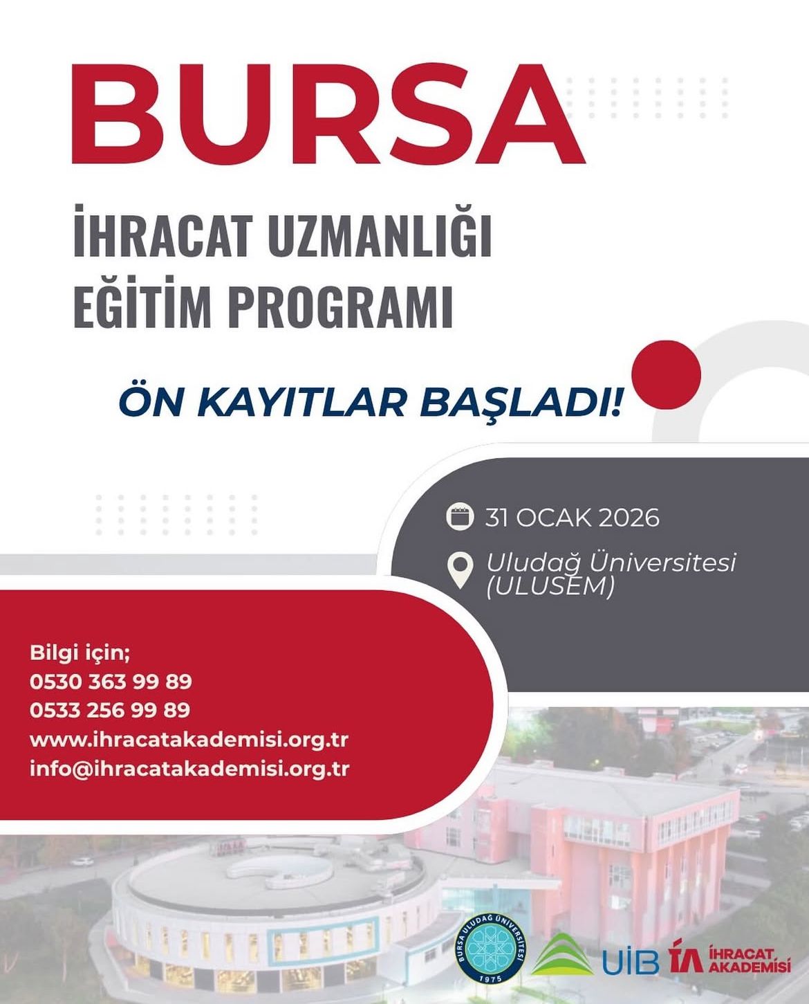 Uludağ Üniversitesi ve Uludağ İhracatçı Birlikleri iş birliğiyle düzenlenecek Bursa İhracat Uzmanlığı Eğitimi Programı için ön kayıtlar başladı. 31 Ocak 2026’da ULUSEM’de başlaması planlanan eğitim, dış ticaret ve ihracat süreçlerinde uzmanlaşmak ve kariyerine güçlü bir yön vermek isteyenler için önemli bir fırsat sunuyor.