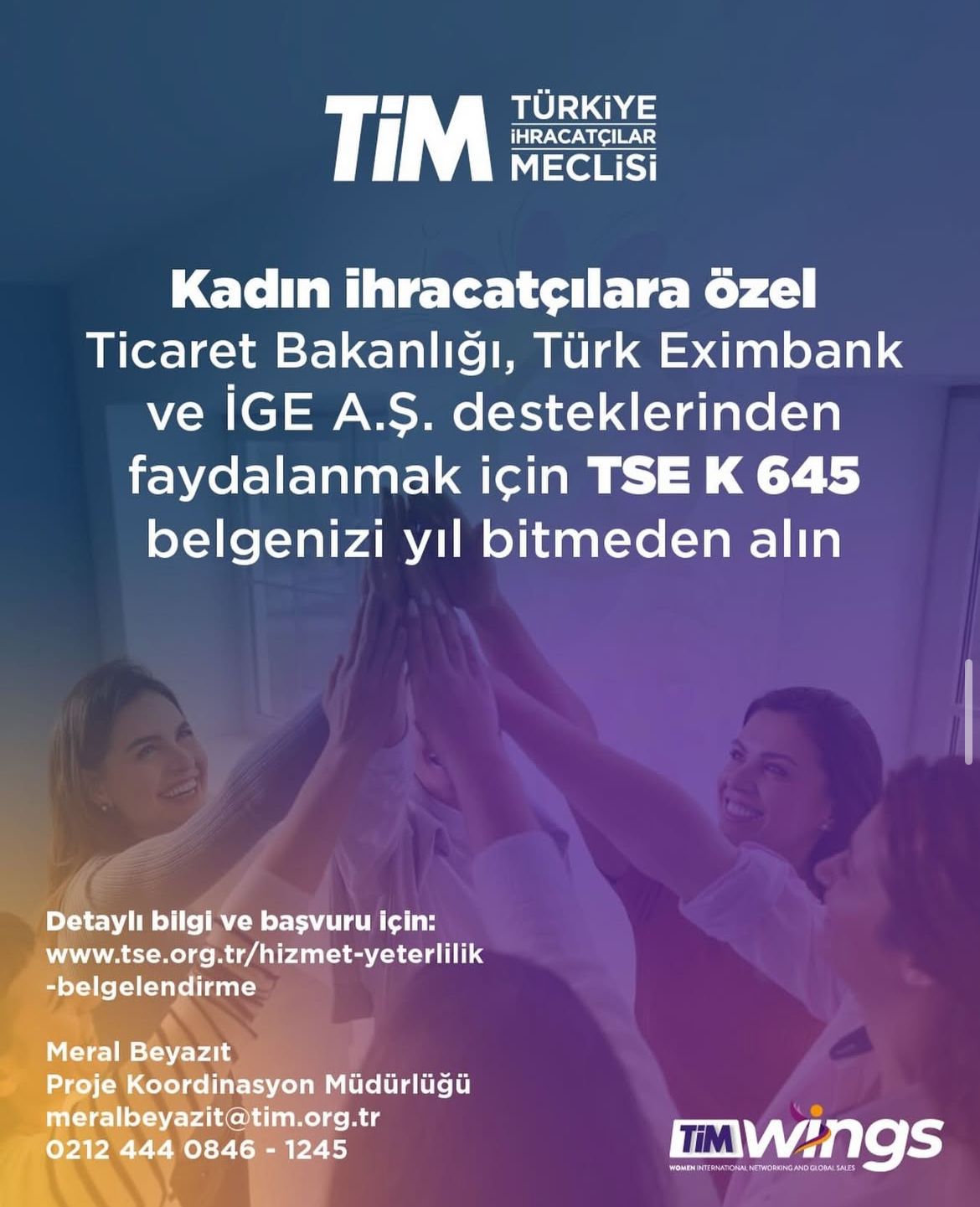 Türkiye İhracatçılar Meclisi (TİM) tarafından hayata geçirilen TİMWINGS projesi kapsamında kadın ihracatçılara özel Ticaret Bakanlığı, Türk Eximbank ve İGE A.Ş. desteklerinden faydalanmak için TSE K 645 Kadın Girişimci Belgenizi yıl bitmeden alın!